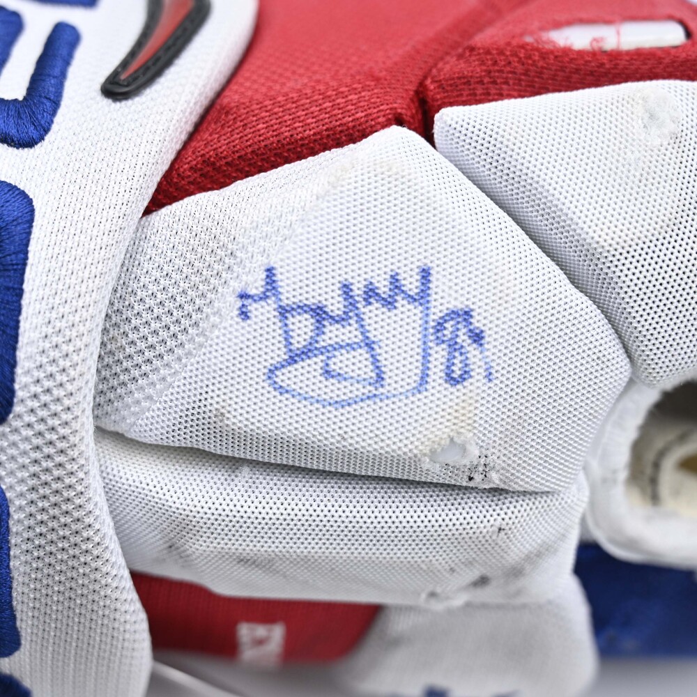 The right glove is photo-matched to the Rangers' 6-4 victory over the Vegas Golden Knights on October 31, 2017 at Madison Square Garden in New York, NY. The left glove did not match to the game. Buchnevich scored a goal and added one assist in the game.