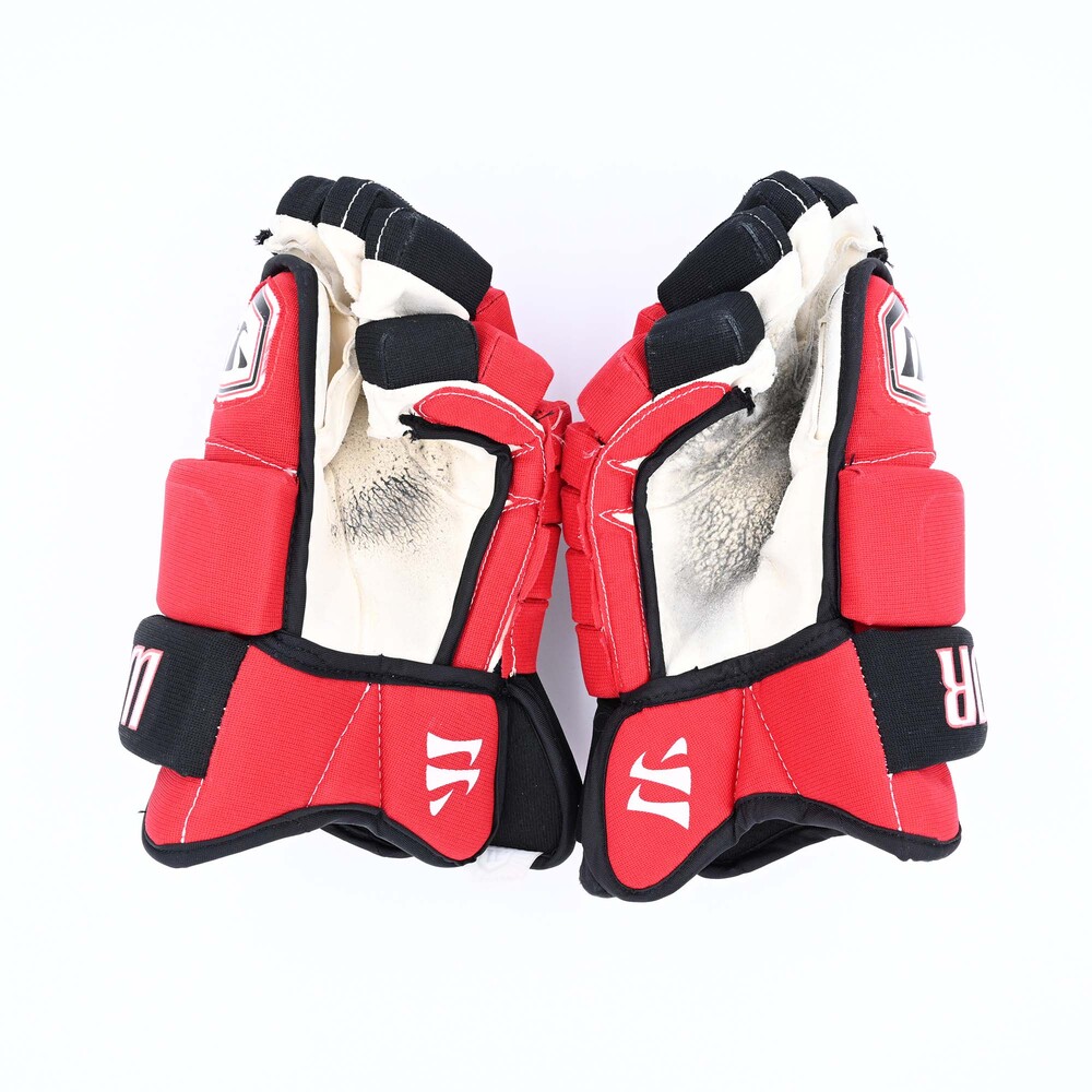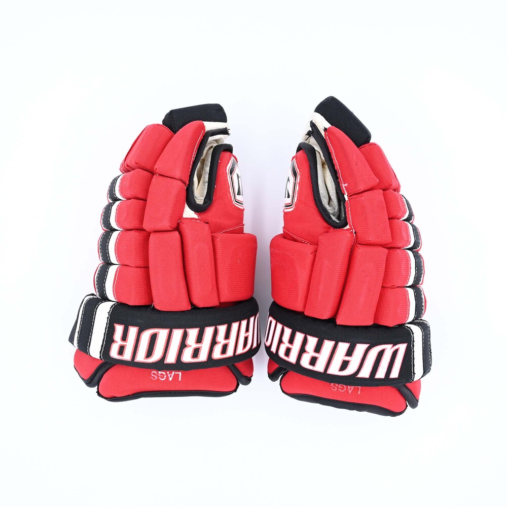 This pair of Warrior Gloves was worn by New Jersey Devils forward Jamie Langenbrunner during the 2008-11 National Hockey League regular seasons.