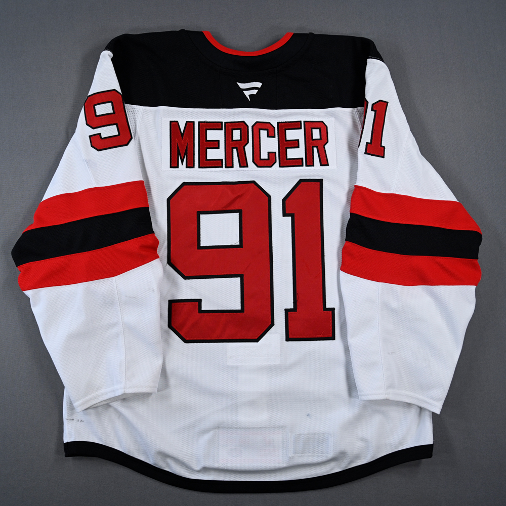 Dawson Mercer wore this white jersey while playing for the New Jersey Devils during the 2024-25 National Hockey League season.